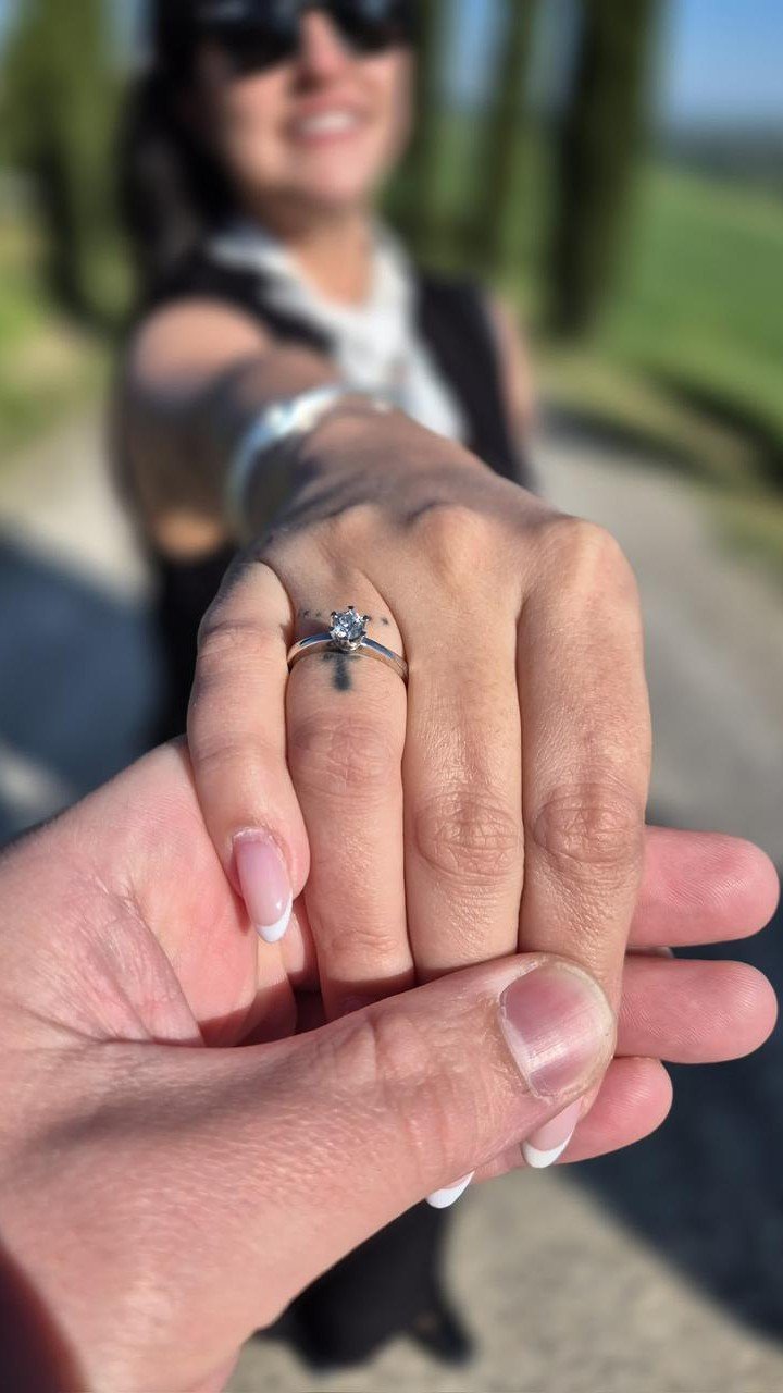 E foi assim, construindo essa história com calma, intenção e parceria (de vida, trilhas, estradas, estádios, pagodes, montanhas e viagens), que chegamos a um dos momentos mais especiais da nossa vida. Na Toscana, só nós dois, na estrada que sempre foi um sonho conhecer, veio a certeza que já morava no coração: o nosso “SIM” era para sempre. Ali, entre paisagens inesquecíveis e silêncio cheio de significado, entendemos que não era apenas um pedido, era a confirmação de tudo o que já éramos.